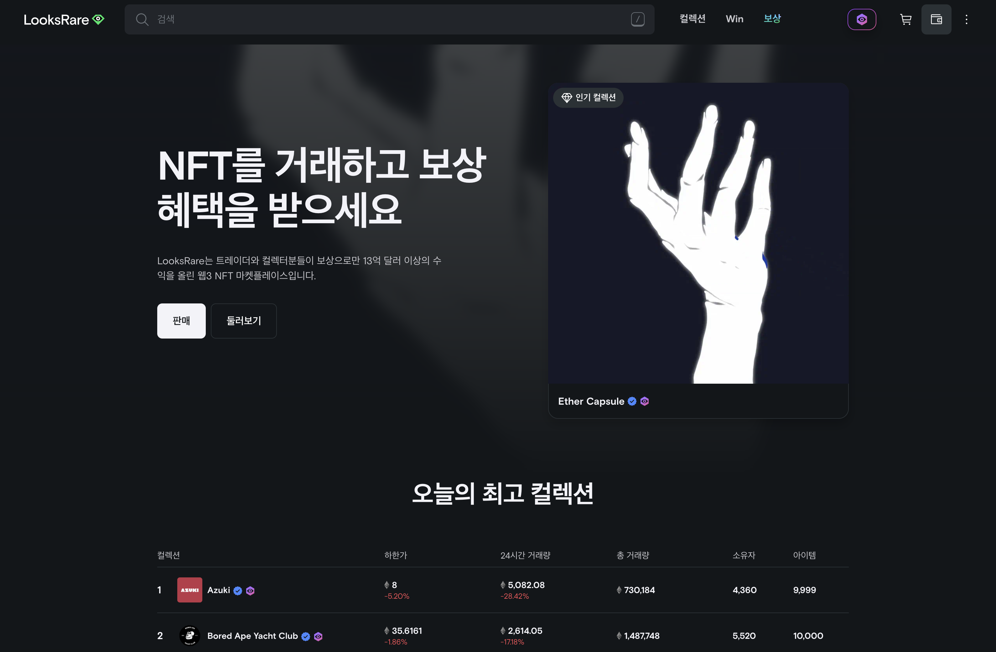 LooksRare는 아직 초기 단계에 있어, OpenSea처럼 다양한 NFT를 제공하지 못하고 있습니다.